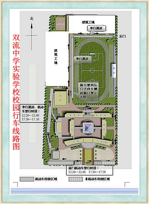 3、学生放学重点时段( 12:20——12:40、17:30——17:50),前校门和行政楼后通道禁止车辆通行。