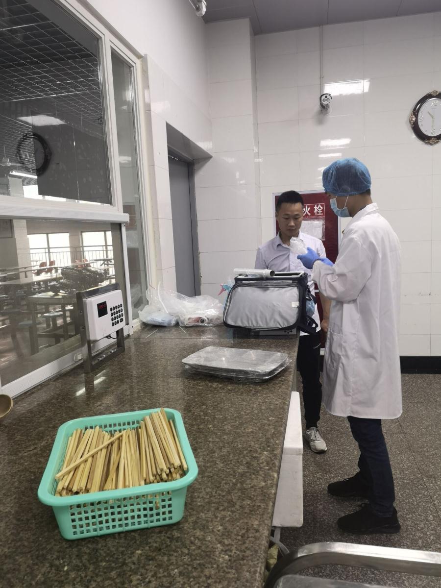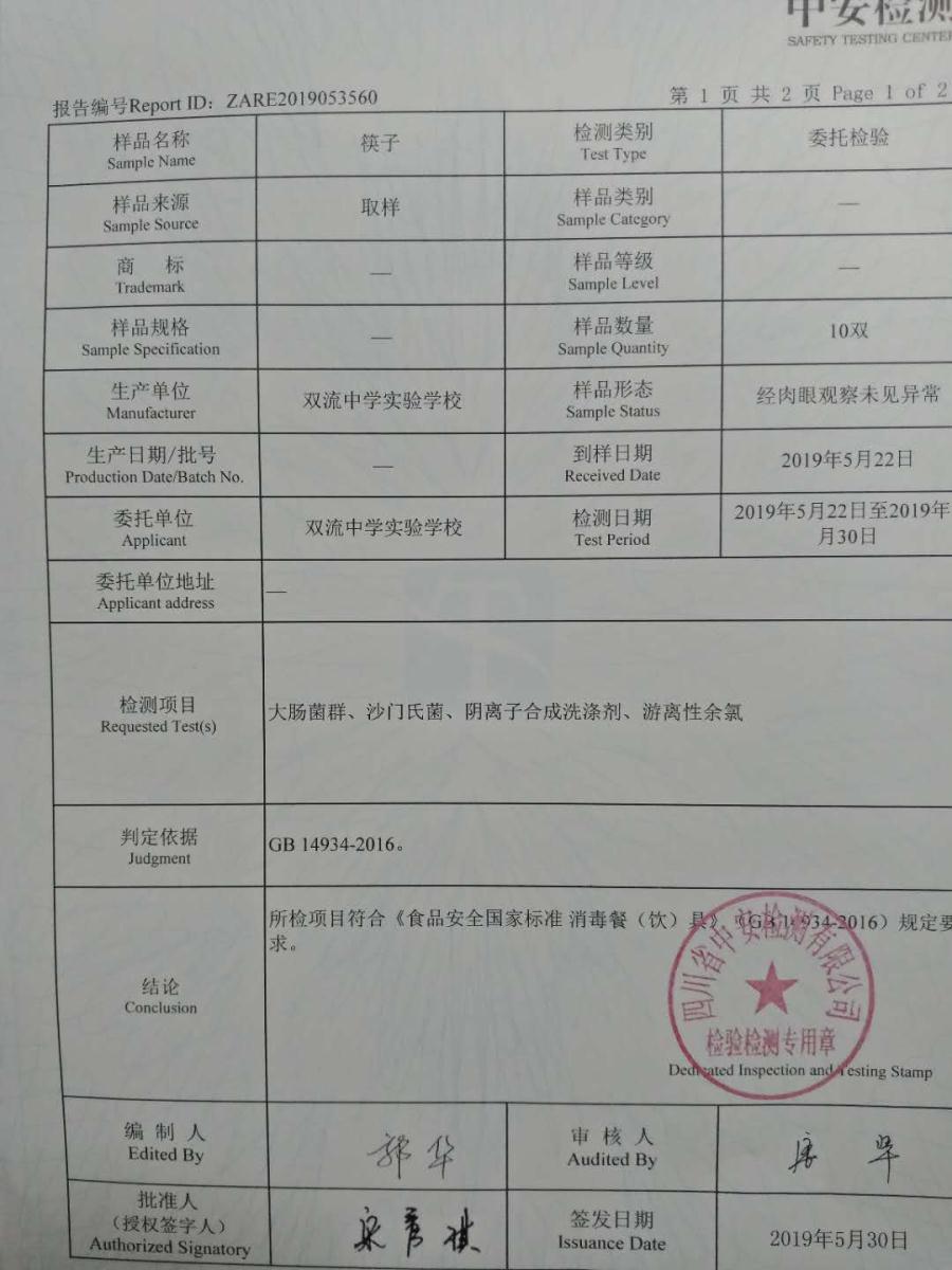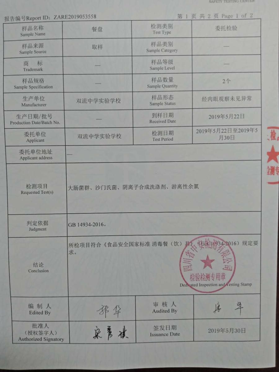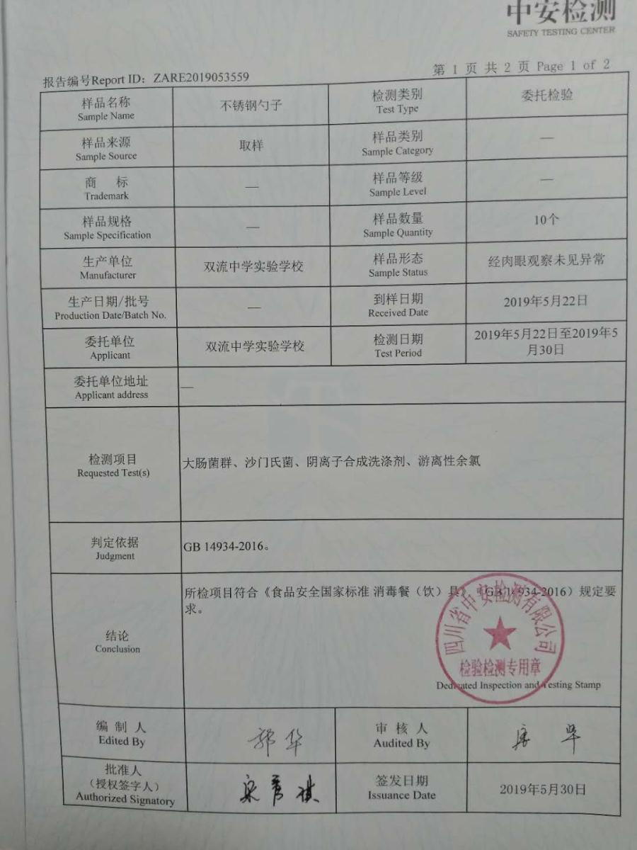 5月22日,根据学校食品安全领导小组的安排,我校食堂主动联系了四川省专注于食品、农产品及环境的第三方专业检测机构——四川中安检测有限公司,公司派出了专门的工作人员到学校食堂抽取样本,本次检测随机抽取了餐盘、筷子、不锈钢勺子、米饭、芋儿烧鸡5个样本,主要检测项目有大肠菌群、金黄色葡萄球菌、菌落总数、阴离子合成洗涤剂等。5月30日,检测报告全部出来了,所有检测项目全部合格。老师们,同学们,在学校食堂就餐可以更放心啦!