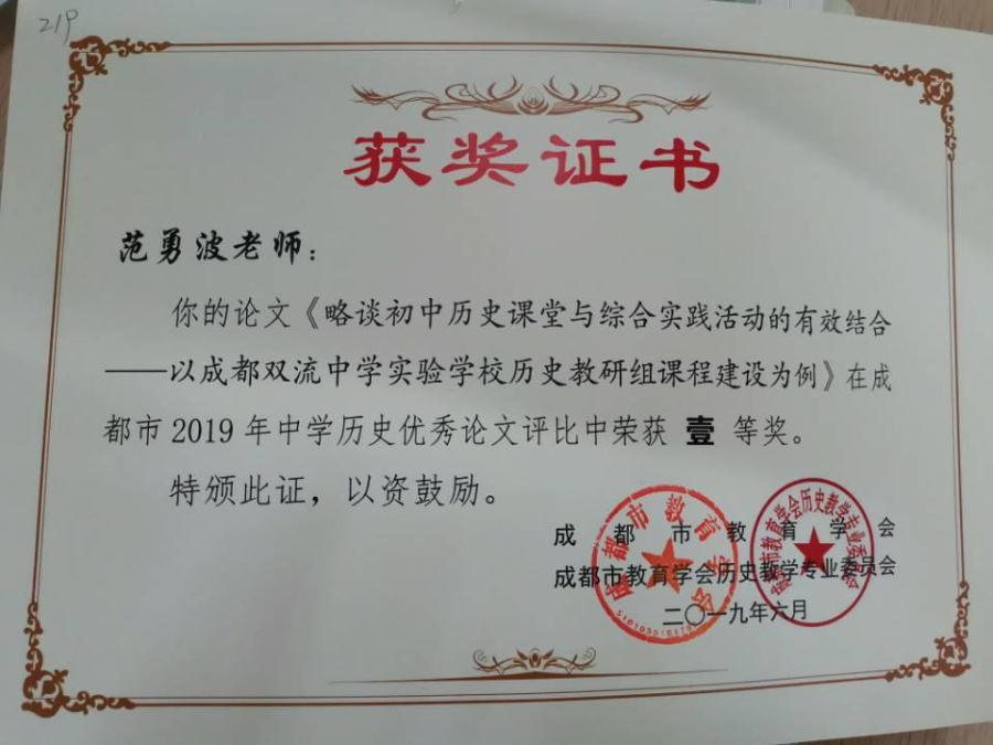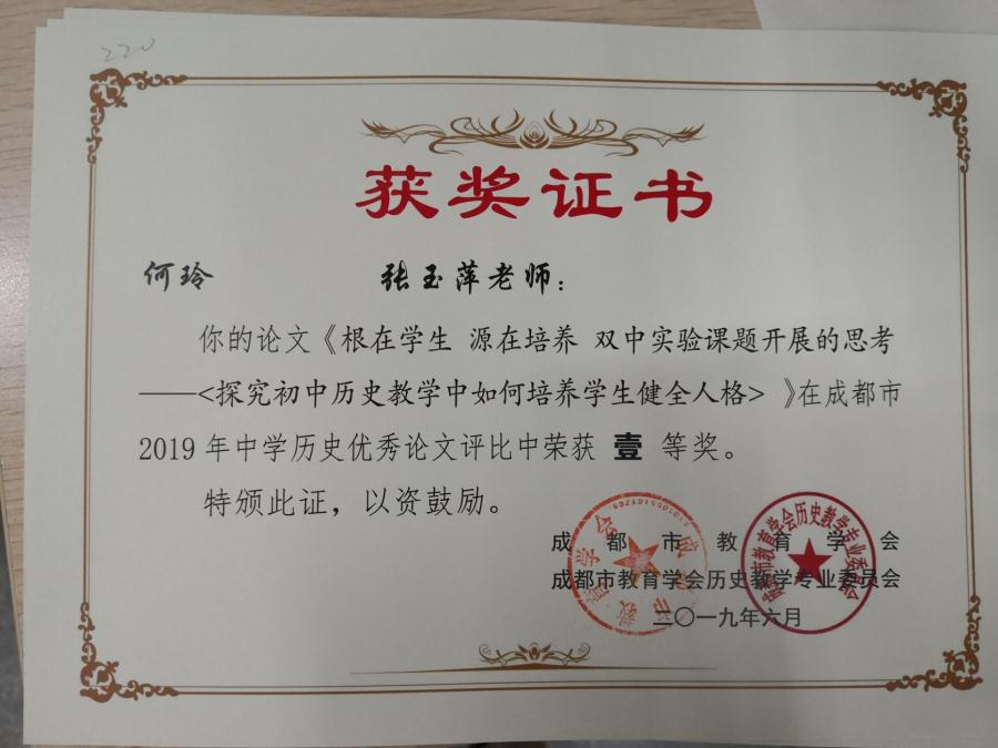 伴随学校课程建设和课题研究不断深入,各类教学教研成果逐渐凸显。近日,我校历史组张玉萍、何玲、李然、范勇波、等4位教师撰写的论文在成都市2019年中学历史教学优秀论文评选中获一等奖,晋云萍老师的论文获二等奖。