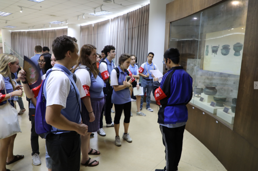 美国学生用中文在双流区双流图书馆完成志愿者解说介绍。从一楼的展览到二、三楼图书陈列再到文物展区,听双流图书馆文物展解说员解说。