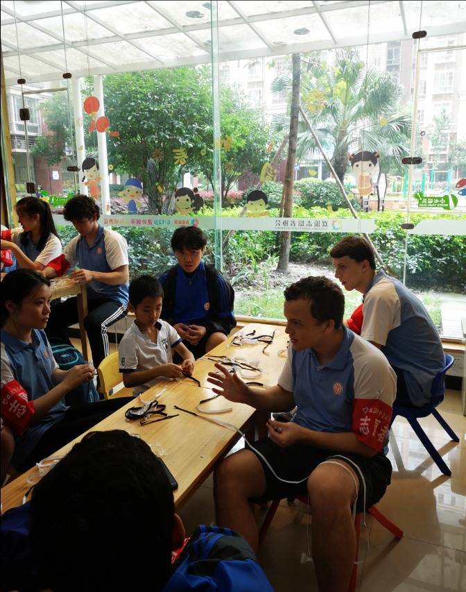 三、7月24日下午,32名美国学生来到双流区双桂社区交流学习,开展其职业体验活动课程。 首先,该社区的社工们带领着美国学生参观了murmur's手工作坊、志愿者服务中心、图书(科普)阅览室、430社区课堂、亲子乐园、姐妹工坊、夕阳公社。让他们大致了解中国社工的工作情况,期间美国学生在夕阳公社里,与老人一起交流,一起“斗地主”,陪老爷爷下棋,乐不思蜀。参观完毕,美国学生回到430课堂,体验手工课堂——制作中国结,由murmur's手工作坊的邓潺老师教学,传播中国传统文化,体验非物质文化遗产的制作。尽管中国结的编制对于我们中国学生来说都很难,但是这些美国小哥哥小姐姐们却意兴盎然。(陈幸)