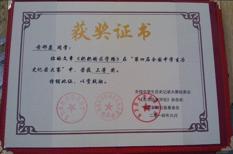 我校学生黄林邻熹作品《奶奶的求学路》参加全国中学生历史记录大赛获全国三等奖!在历史组王小玲老师的悉心指导下,我校学生多件作品参加了本次大赛,经过初选、分赛区决赛、总决赛等重重比拼,黄邻熹同学的作品在全国上万件作品中脱颖而出,喜获三等奖,全国仅有80名选手入围,四川省仅一名选手获奖。由于我校在组织学生参赛方面表现出的积极性,组委会特授予我校优秀组织奖,王小玲老师被评为优秀指导教师,特此祝贺!
