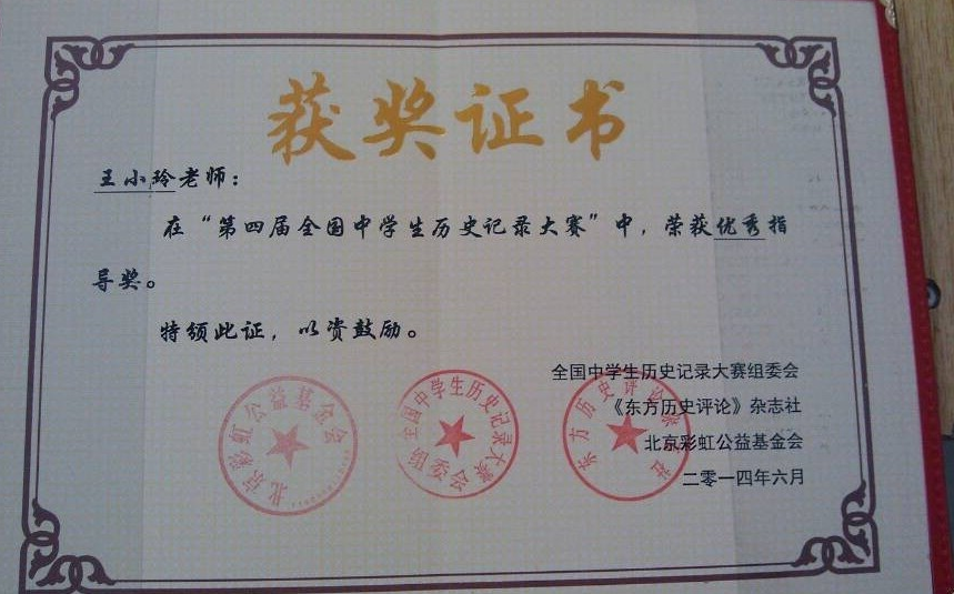 王小玲老师指导学生在全国中学生历史记录大赛中获奖