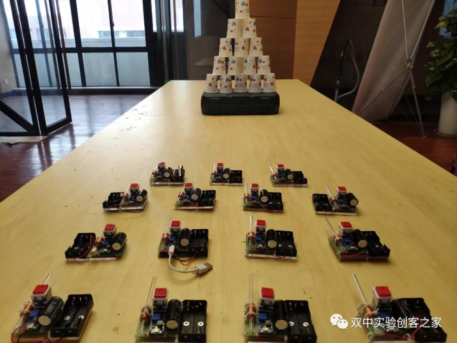 究竟效能如何?我们要通过比赛来验证。在老师的组织下,同学们在5月20日进行了射击堆叠纸杯的比赛。比赛以3次击落纸杯数量的总和作为评定名次的依据。
