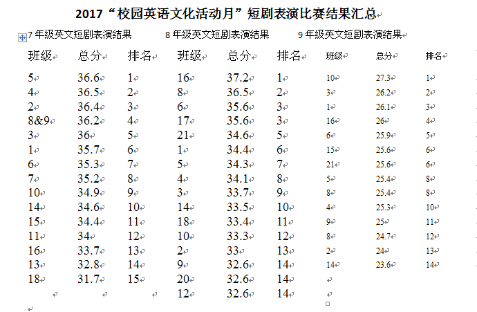 2017 英语文化活动月7、8、9年级英文歌曲演唱成绩单