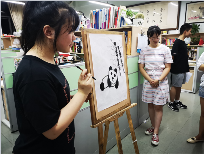 小老师们声情并茂地教着美国学生如何用毛笔画熊猫,一边教还一边提醒使用毛笔的注意事项。有了之前的介绍与铺垫,美国学生们在小老师的引领下很快就画出了神态各异的大熊猫。小老师们对学生们的作品一一作出点评,并对画好中国水墨画给出了自己的建议。