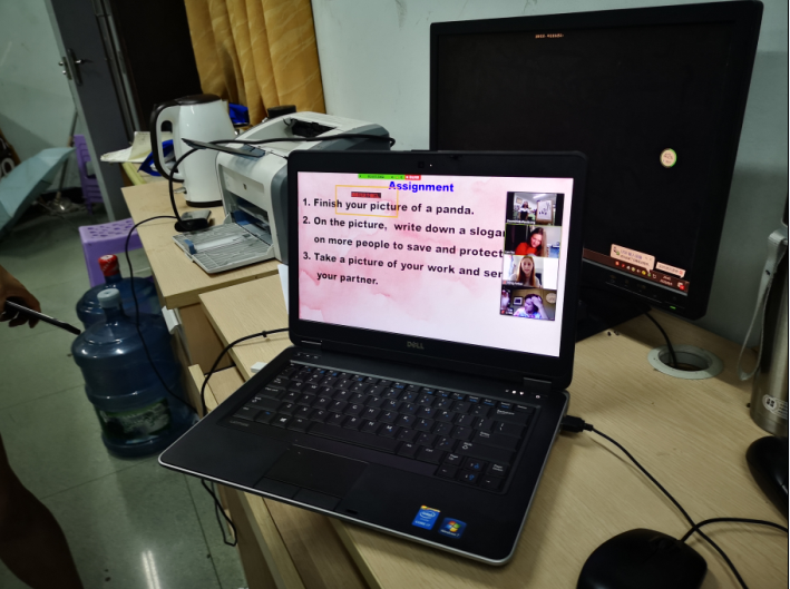 8月5日晚,我校八年级英语班的五位同学为满足美国学生的“熊猫情结”,精心设计了一堂“乘风破浪”画熊猫的文化体验课。同学们先通过一段熊在猫基地拍摄的视频,向美国学生介绍了熊猫的生活习性和特点,还根据视频内容,设计了几个互动的知识抢答来加深美国学生对熊猫的了解。然后同学们又通过电影《功夫熊猫》中的一些片段,向美国学生展现了熊猫在不同情境下的各种面貌,由此开启美国学生画熊猫之旅。