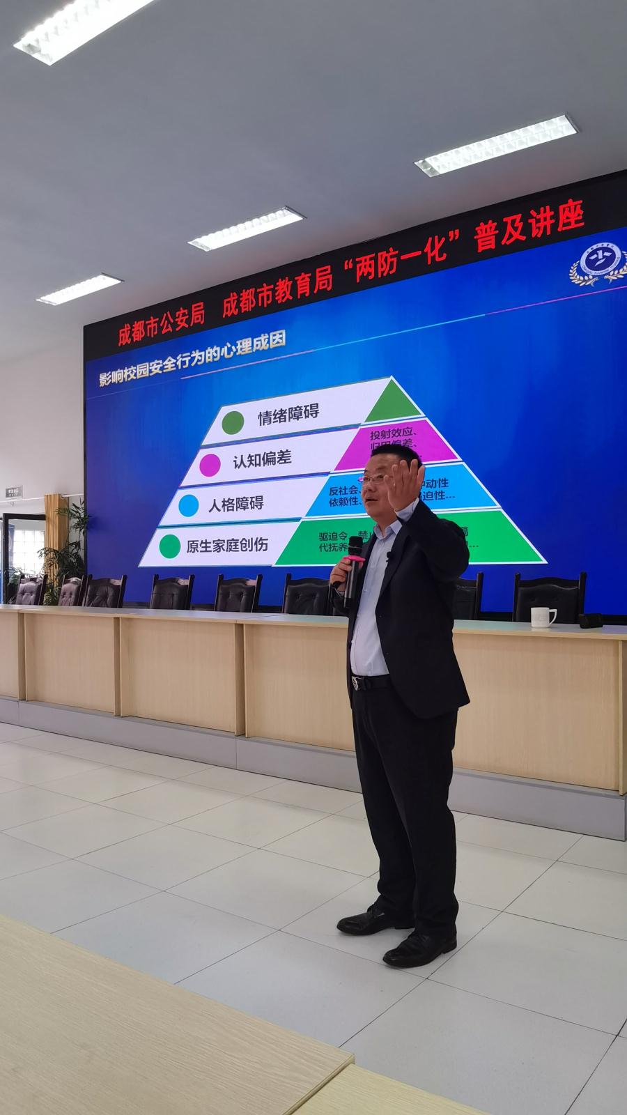 在本次“两防一化”专题讲座活动中,首先由双流区公安局棠湖派出所扎西青措副所长强调了校园“两防一化”工作的重要性,并对警校共育、共筑平安校园建设工作的推进情况进行了介绍。