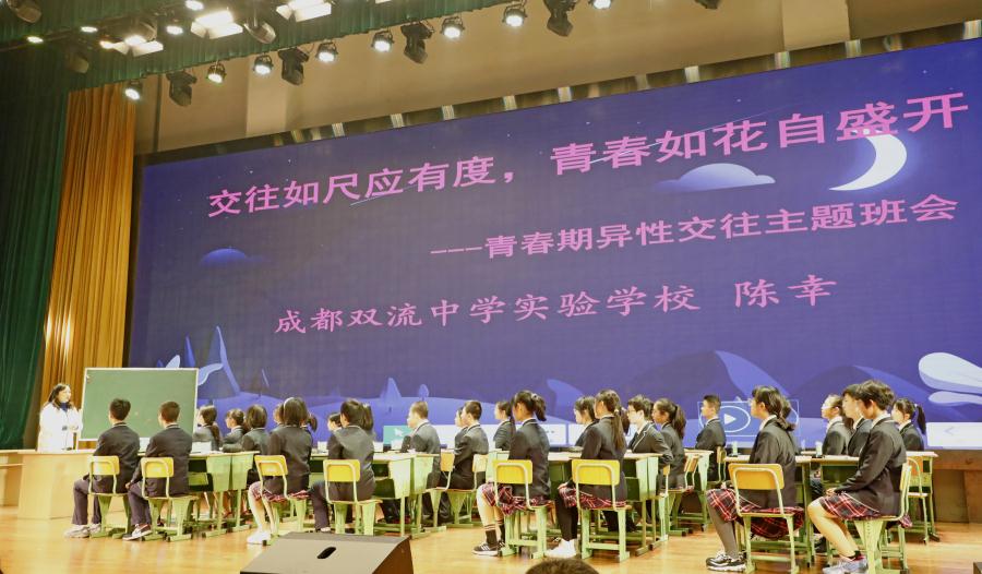 成都双流中学实验学校名优教师、成都市优秀班主任陈幸老师主题班会公开课,她以班级管理子课题组在前期调研的八年级学生普遍存在的男女生人际交往困惑与障碍,而学生又苦于无法合理地把握男女生交往尺度的学情现状为主题,设计了初中男女生人际交往的主题班会课《交往如尺应有度,青春似花自盛开》。陈幸老师的这堂课通过“0.49米的距离”的体验活动,让学生在现场亲身感受合理的和不合理的异性交往距离的差异,从而明白异性交往的适当的社交距离;让学生描写自己理想中的异性并观看林徽因和梁思成的爱情经历,从而让学生努力将自己打造成为一个拥有独立精神世界的人;让学生把对理想中的另一半的美好期许写进时间胶囊封存起来,为了遇见更好的对方而树立努力奋斗的远大志向,引领学生思考青春期异性交往的尺度以及如何成为更好的自己——不负青春不负卿。