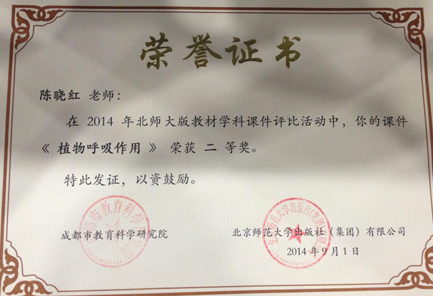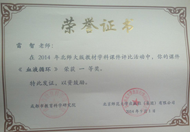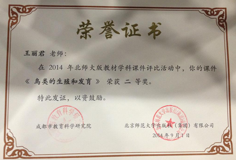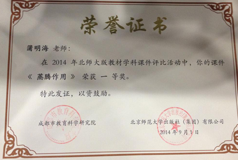 在2014年北师大版教材学科课件评比活动中,我校生物组有4位老师获奖,其中蒲明海老师的《蒸腾作用》、雷智老师的《血液循环》分别荣获一等奖,陈晓红老师的《植物呼吸作用》、王丽君老师的《鸟类的生殖和发育》荣获二等奖。(生物组 雷智)