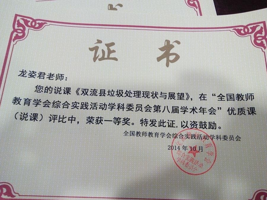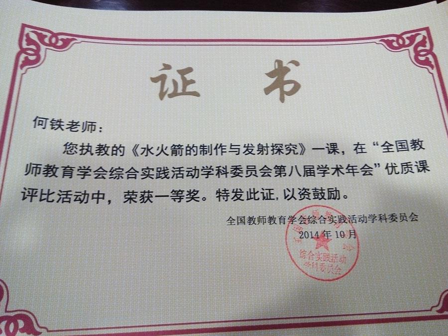 本届年会上,我校除何铁老师的现场展示课、龙姿君老师现场说课荣获一等奖以外,学校课题组研究成果还分别在各类成果评选活动中获奖。学校被评为“2014年全国综合实践活动先进集体”(全省共六名);在优秀研究论文评比中,我校共有10篇论文荣获一等奖,15篇荣获二等奖;在论文收录与发表方面,杨四维、李东平、朱春烨等老师的八篇论文发表于国家级期刊,全国范围内单个学校发表数量最多的;在视频录像课例评比中,罗晓章、叶平、罗远洋、龙姿君、杨四维五位老师的四件课例荣获一等奖,丁翔、韩科、雷智等8位老师的课例分获二等奖。