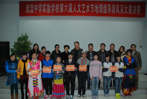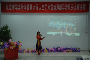 2013年11月28日,为更好的丰富校园文化生活,培养学生健全人格,地理组以学校人文艺术节开展为契机,结合八年级中国地理知识,在多功能厅顺利举行第六届人文艺术节导游风采大赛决赛。参赛对象为我校八年级学生,经过两个月的初赛复赛,层层选拔,最终9位选手脱颖而出进入决赛。张校长、周主任、刘主任出席了本次活动。决赛环节分为自我介绍、景点讲解、现场抽题、评委提问、才艺展示五个环节,在决赛中各位选手表现出了最佳状态,赛出了最佳水平,其中让人印象最深刻的是八年级十七班苏培玉同学,讲解的景点是她家乡甘孜州丹巴县梭坡古碉群的自然风光与人文特色,赢得了在场老师同学的热烈掌声。在才艺展示中,形式多种多样如配乐诗朗诵、民族特色舞蹈、魔术、书法、歌曲等,充分展现出我校学生丰富的课余生活。