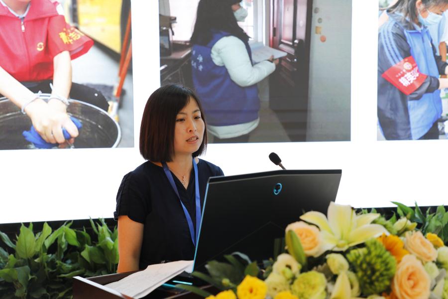 曾艳老师对社会服务类课题研究成果进行展示交流,从研究内容、参研群体、参研时间、评价量表、评价方式及评价标准进行了阐述,展示了课题组开展的各类活动与《社会服务手册》等物化成果。随后,八年级四班曾潇禾同学结合自己亲身参与的暖冬活动——关爱留守儿童为例介绍了社会服务是如何探究并有效实现其育人价值。