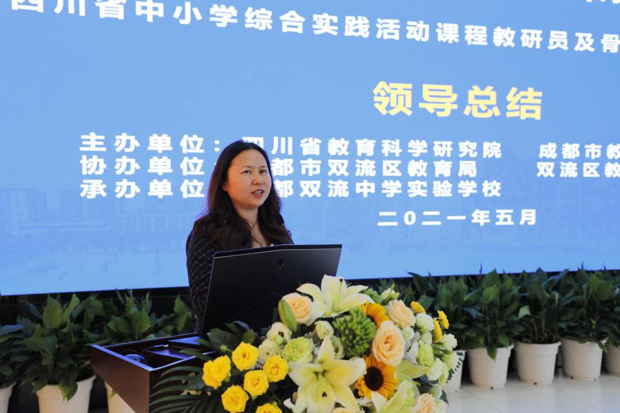 最后,四川省教育科学研究院董洪丹副院长作大会总结。他代表本次活动的主办单位感谢领导、专家们的关怀与指导;高度赞扬双流中学实验学校在综合实践活动课程建设方面持续十八年的坚持探索实践;对学校为课程改革和课题研究付出的艰辛与努力及取得的优异成绩表示充分肯定;对学校进一步深入研究提出了更高的要求;勉励研究团队在专家指导下进一步深化研究,后续精心打磨,提炼精品成果,充分发挥示范引领辐射作用。
