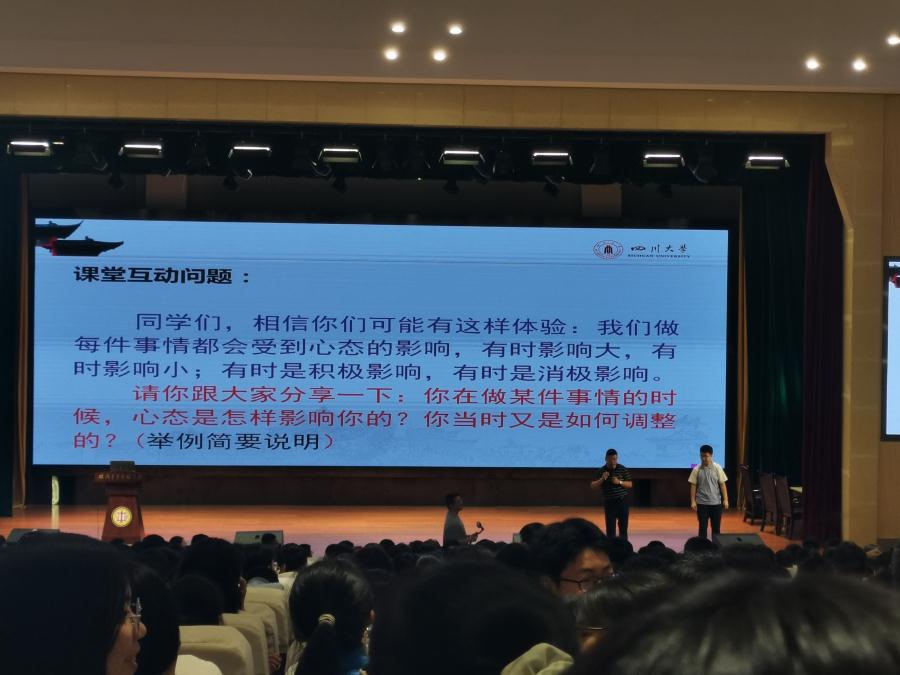 在讲座期间,陈教授运用了多种方法进行讲解,首先陈教授利用自己所经历的个案现身说法,为了了解他们的真实心理,陈教授还在现场对一些同学进行了现场采访,同学们都很踊跃地发言,说出自己的感受和困惑。现在气氛非常活跃。