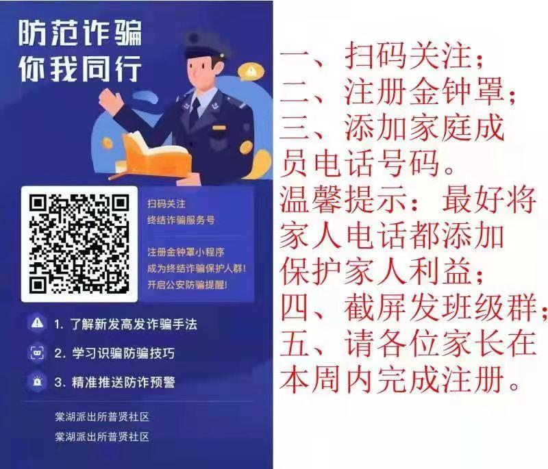 通知:各年级班主任注意,为提高大家防骗意识,预防电信诈骗。请各班主任将派出所推送的防骗防诈二维码和操作步骤发送到班级群,通知家长扫描二维码关注终结诈骗公众号,在公众号里注册金钟罩小程序,开启公安防骗提醒。双流中学实验学校安全处!