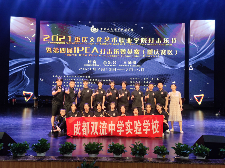 2021年7月15日,中国第四届IPEA打击乐菁英赛西南(重庆)赛区比赛在重庆隆重举行。由四川、重庆、云南等地选拔推荐的200多名选手同台竞技。我校打击乐团在艺术组吴玲、夏栋梁两位教师带领下参赛,并成功获得中国第四届IPEA打击乐菁英赛西南(重庆)赛区少年组金奖,并受邀参加当天晚上的颁奖音乐会演出,充分展示了双流中学实验学校近年来在教改方面的新成绩、新风貌。