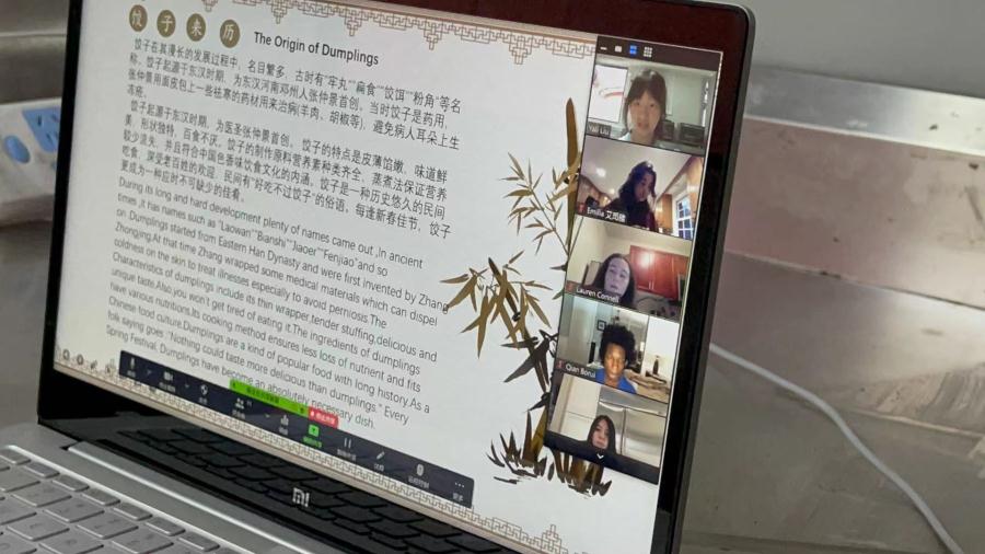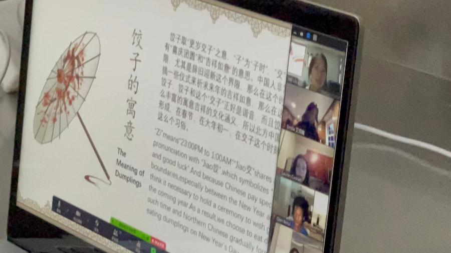 课堂开始过后,杨老师和我校的七位同学分别做了一个简单的自我介绍后,我们有趣的线上文化体验课便正式开始了。杨老师首先带着美国学生一起了解一些中国的特色节日,如端午节、中秋节等,以及这些节日的传统习俗和传统食物,而且了还学习它们的中文,美国学生也对它们颇感兴趣,都积极参与和杨老师的互动。当提到中国春节,美国学生首先想到的是鲜美的饺子,杨老师和我校同学们便介绍了饺子的来历和寓意,帮助美国学生们进一步了解中华特色传统美食:“饺子”,美国同学们也都直呼,“Wow!”那像饺子一样充满寓意的中国美食还有哪些呢?杨老师又为美国同学们介绍了代表“年年有余”的“鱼”,和代表“团圆”的“汤圆”。看来美国同学又在本次线上文化体验课上了解到了谐音在中国饮食文化中所起的重要作用。为了让美国同学们更能体会饺子对于中国人民的重要意义,杨老师又播放了一则关于过年包饺子的纪录片的节选。