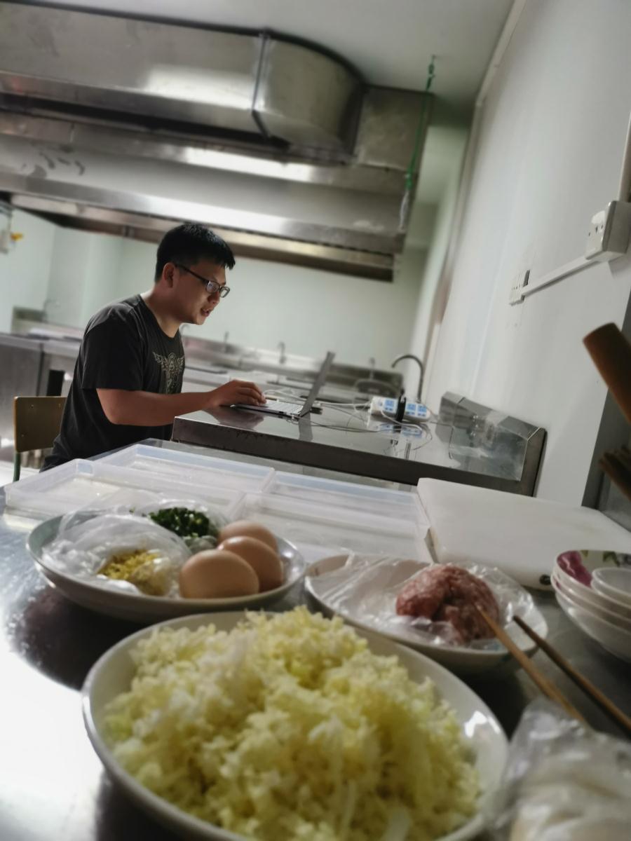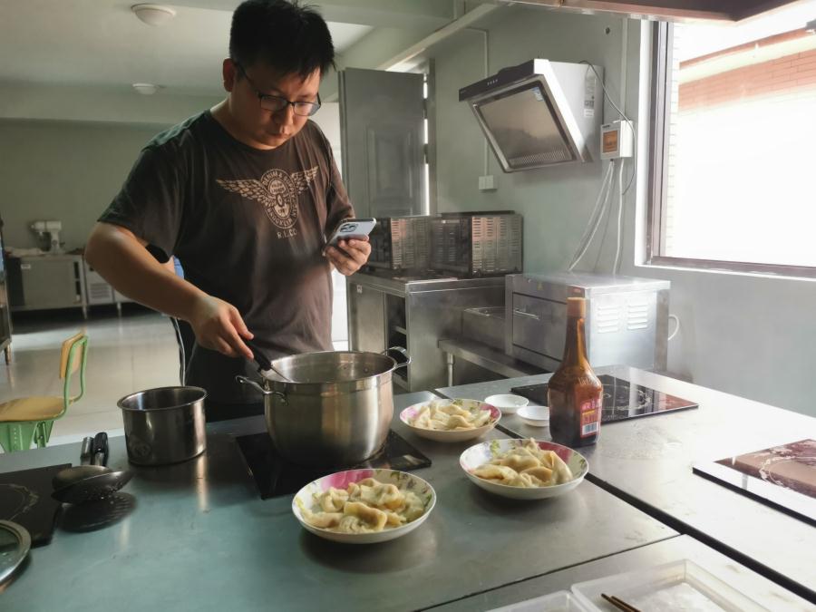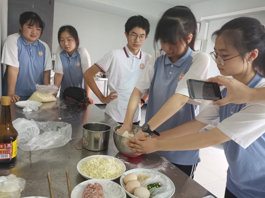 在大家对饺子都有了由表及里的认知后,课程进入了第二环节----制作饺子!制作饺子第一步,也是非常重要的一步便是选材,那具体又应该如何操作呢?其实,最好的选择就是自己选择,肉类和蔬菜类都可以随意选择,随意混搭。当然也不要忘记准备适量的鸡蛋和调料。考虑到美国可能不太好买到韭菜,同学们准备了经典的白菜和猪肉。第二步:处理材料。这一步很简单,只用将所有准备好的材料全部剁成末状。接下来还得需要制作面皮,同学们进行了讨论,可以自己和面擀皮儿,也可以去购买外面已经制作好了的面皮。为了让美国学生们拥有更加深刻的体验感,杨老师和同学们提议尽量选择第一种方式。处理完材料过后,便可以进入到第三步:和饺子馅。这一步也很简单,只用将刚才处理好了的材料全部倒在一个碗里,然后搅拌均匀。美国学生们做到这里时,有的使用了工具,也有的直接使用了手。虽然方式不同,但是大家做出来的效果都很不错。而当大家即将要进入下一步时,有一位可爱的美国同学竟然将制作好的饺子馅炒了。不过不要紧,“百花齐放才是春”嘛!而包饺子时,大家包的都是形状各异,但是经过沸水煮了过后,看到成果,也都十分满意。最后,这堂别具一格的线上文化体验课在同学们的欢笑声中里完美结束。