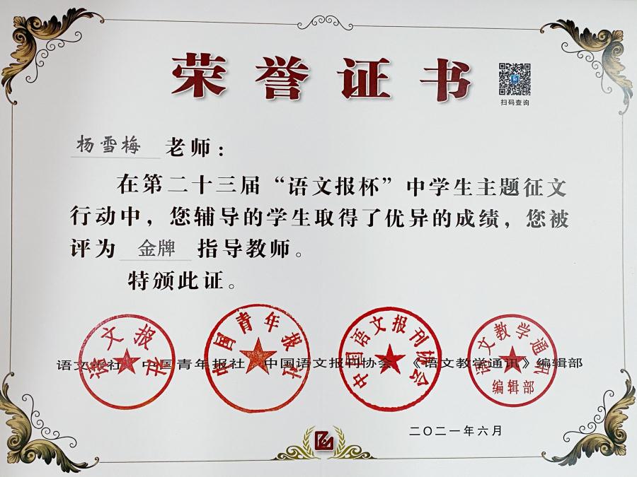 在此次征文评选活动中,我校初中部全体学生在语文老师的全心带领下,踊跃报名,挥洒笔墨,书写心之所想,共91人获得佳绩。其中,朱雨桐、周昱彤、黄韵菡、吴宇涵、潘又琳等5名同学获得金牌,杜翕然、何金晶等8名同学获得银牌,唐艳娇、刘佳怡等16名同学获得铜牌。此外,还有15名教师分别荣获金银牌指导教师称号。