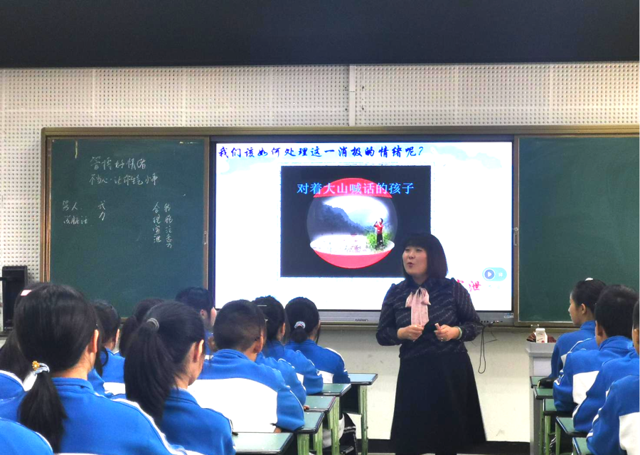 袁老师的班会课名为《管控好情绪,放飞好心情》。袁老师通过小白兔的故事,让学生们体会到“语言是心灵的镜子”,要管控和处理好自己的情绪。接着袁老师又通过吹气球的游戏让学生学会释放自己的消极情绪,认识到把消极情绪别在心里对身体是有害的。袁老师还给学生们播放了音乐《假如幸福的话》、阅读了文章《对大山喊话的孩子》,通过美妙的音乐和优美的文章让学生感受如何处理自己的消极情绪,并在同学之间互相分享。