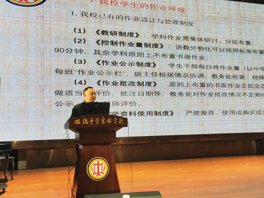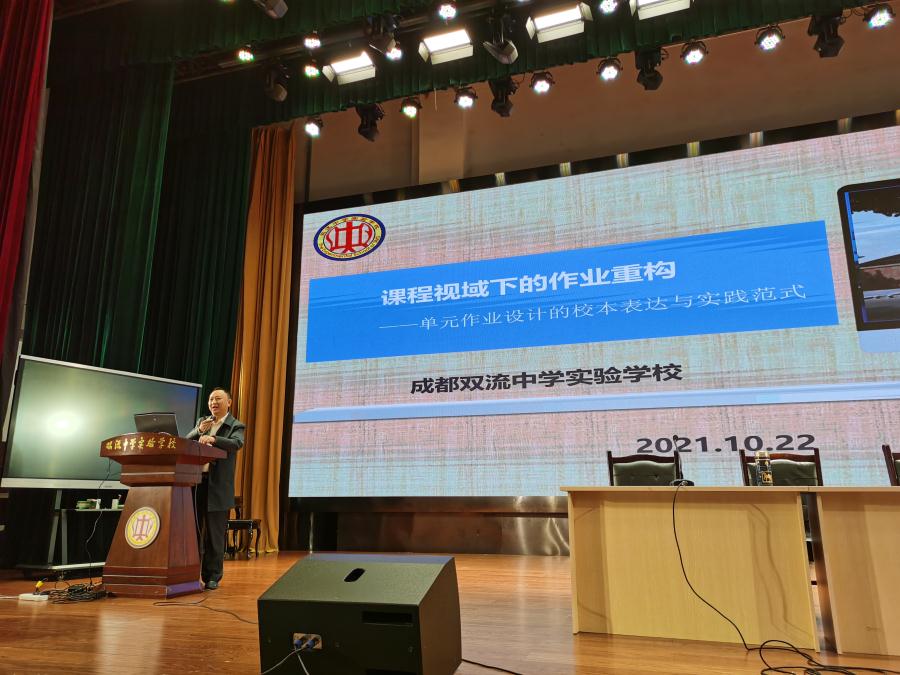 作业是折射学校教育价值观和专业水平的名片,是教学评价相结合的支撑点,是学校、社会和家庭的连接点,是影响学生学习兴趣、负担和成绩的关键点。双减政策背景下,学校作业改革将面临一系列新的挑战。20211022午,成都双流中学实验学校“致远讲堂”在多功能厅开讲,罗晓章副校长作了题为“课程视野下的作业重构——单元作业设计的校本表达与实践范式”的报告学校初中部、高中部全体教职员工到场聆听报告。