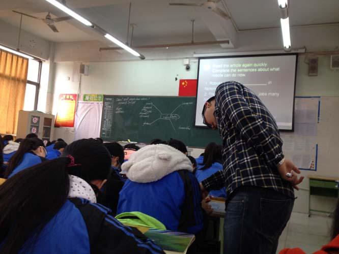 2014年11月20日上午第四节课,我校英语组杨四维老师在八年级十九班上了一堂“人人献课”公开课。课题为八年级上册Unit7 Will people have robots? SectionB 2a-2e 课型为阅读课。课堂上,杨老师利用精心制作的课件,向同学们展示并且讨论了各种形状和功能的机器人,提起同学们兴趣的同时为阅读搭建“脚手架”,扫除障碍。课堂展现了完整的阅读步骤和丰富的阅读策略,亮点频出。最后以同学们讨论是否支持JamesWhite的“机器人不能进行思考”收尾,同学们各抒己见,有的同学则表示要敢于梦想,挑战一切不可能,这种积极的生活态度是文章想要表达的,也是值得我们去学习的。