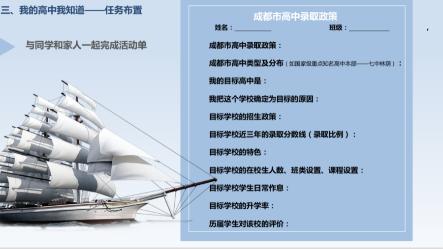 本课题旨在帮助学生清晰自己的目标高中,了解自己的目标高中,并以目标为导向激发当下学习动力。课题由两课时组成,以活动——调查——汇报的形式进行。第一课时活动、布置任务,学生课后与同学家人一起调查完成活动单并制作我的高中小报。第二课时,学生在班级以ppt、小报形式汇报。