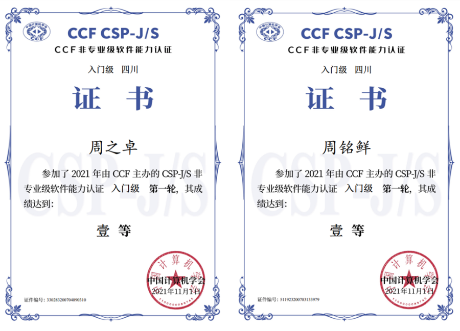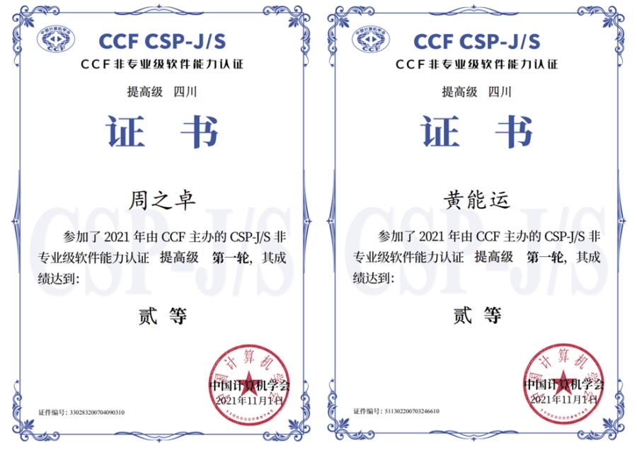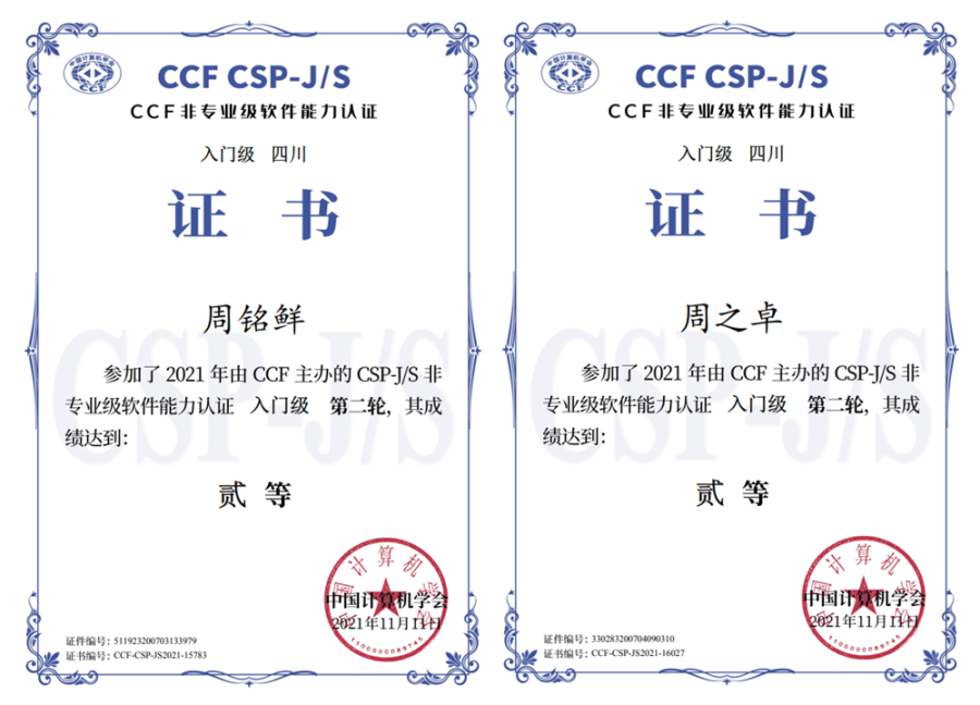 CSP-J/S第二轮认证(复赛)于10月23日举行,来自全省各地的学生参加了在树德中学光华校区举行的比赛,我校2名学生参赛,最终来自九年级的2名同学(周铭鲜、周之卓)同时获得二等奖,其中周铭鲜同学为该项赛事初中组双流区的第一名。