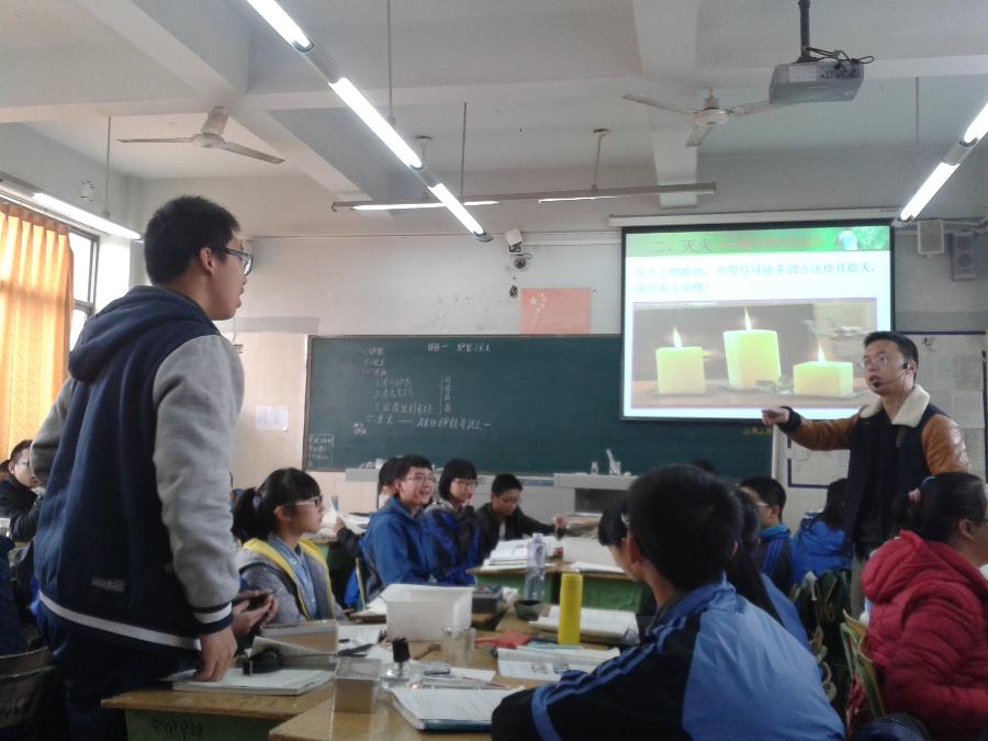 2014年12月2日(星期二)上午第5节课,我校优秀青年化学教师李雄老师在九年级13班展示了一堂精彩的公开课——《燃烧和灭火》。 李老师采用“探究式教学”模式,通过构建两组科学探究学习情境,引导学生通过实验探究主动建构燃烧和灭火的知识体系,总结出燃烧的条件和灭火的原理,同时对知识进行了拓展应用。整个流程循序渐进,一气呵成,让学生既掌握了燃烧与灭火的知识与技能,又体验了科学探究和控制变量的学习过程与方法,同时还培养了化学社会技术环境的情感态度与价值观,体现了新课程改革理念,学生学习效果显著。