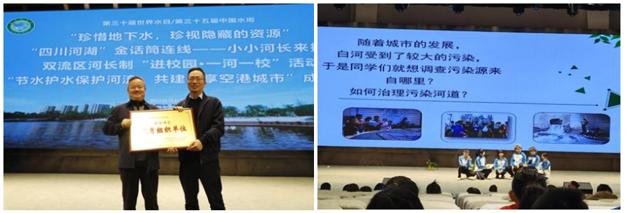 2020年,小小河长被评为成都市 “最美护河人”。在本次活动中,江昶邑、詹佳淼等9名小小河长被评为2021年优秀小河长,李春燕、方艳秋、杨荟民老师被评为优秀指导教师,同时,武辰曦、林玗琪等25名同学被授予2022年第五届小小河长荣誉称号。 双流中学实验学校荣获“小小河长优秀组织单位”,并由成都市双流区教育局局长陈廷刚颁发奖牌。环保路上,护河之途,学校将秉承初心,继续前行。小小河长薪火相传,在传承与整合中将生态文明理念和节水护水保护河流意识辐射全区,带动全民,让青山绿水长驻,让城市自然共生!