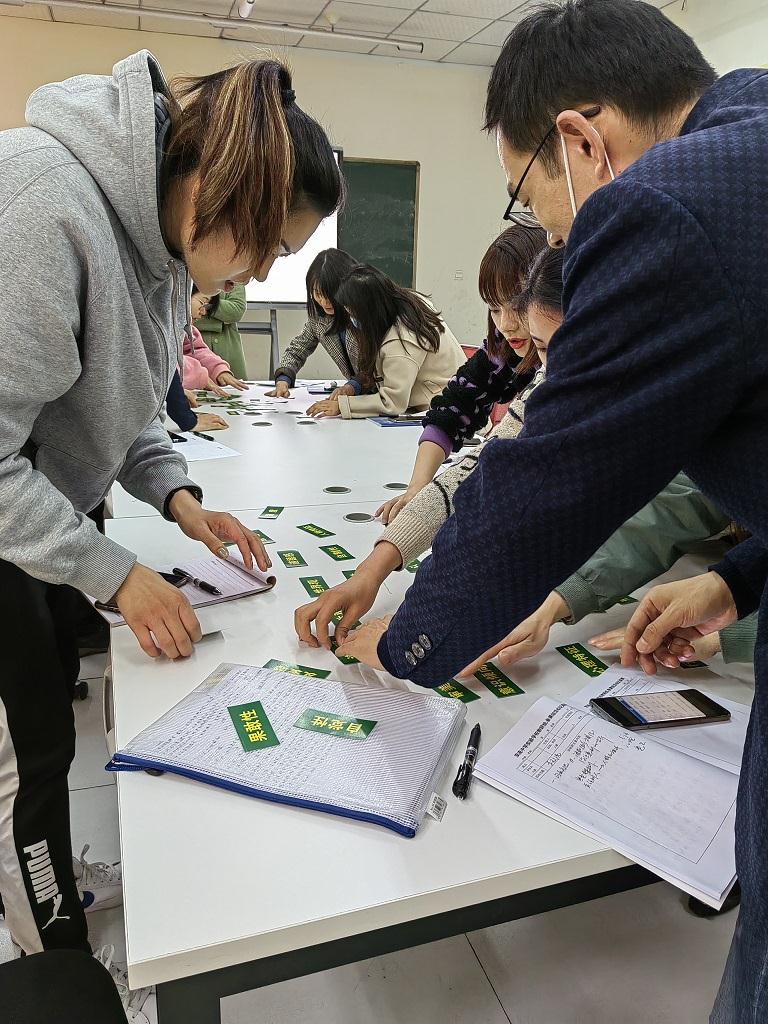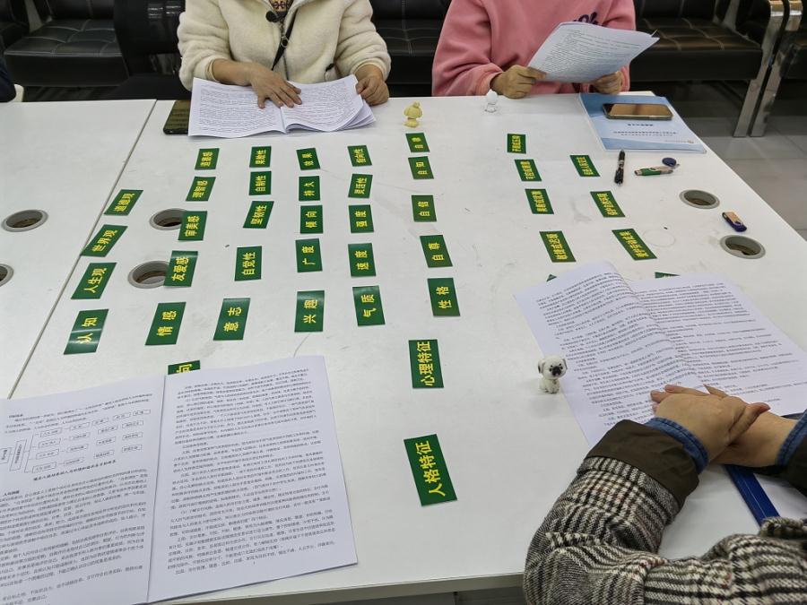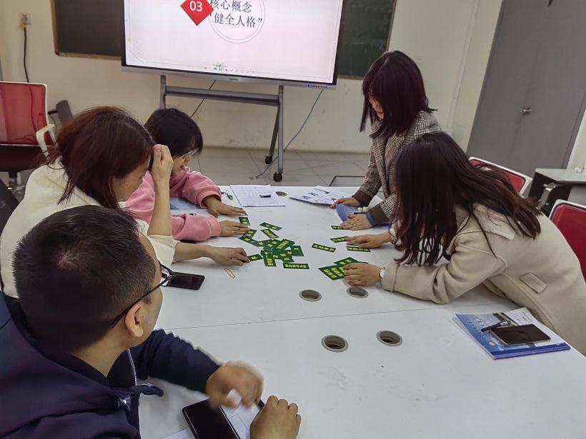 为了更好的帮助老师们快速记忆健全人格目标体系的3个维度,8个版块,30个要素,王主任为老师们设计了“健全人格拼图游戏”环节。老师们按照文科组和理科组分组,最短的时间内完成健全人格要素拼图的组获胜。老师们时而思考,时而排列,时而检查,时而纠正,充分享受游戏快乐的同时又快速掌握了健全人格的目标体系。