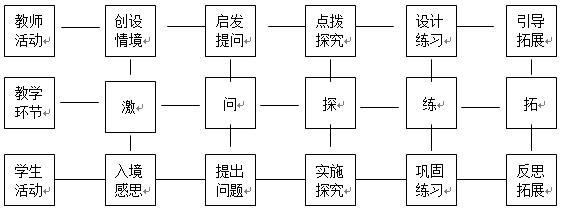 2.构建了自主合作探究式课堂教学的总模式:“激 — 问 — 探 — 练 — 拓”五环节教学模式。