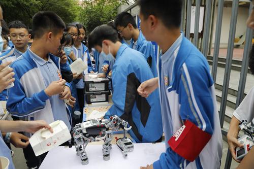 这次科技节形式多样,创新增趣。首先,本次展示会串联了学校各学科、整合了现有选修课程,将四十多个项目分为比赛类、展示类、互动类项目三个方向同时在操场开展,这真可谓是一次科技活动的饕餮大餐。其次,组委会创新采用“游园会”的活动形式,在活动前给学生分发活动指南,让学生全面了解展示活动内容,明确活动展台的所在位置,学生在参与展台活动后,即可收获一枚活动印章。展示会后,各班会对活动印章的数量进行统计、上报,由组委会评出优胜的班级、同学予以奖励。不仅如此,会场还设有“抽奖处”,凭借活动印章即可抽奖,在最后的旅程中再添惊喜!阅、评、奖几个环节贯穿活动项目极大地增强了本次科技节展示会的参与互动性——展示者侃侃而谈,观展者兴趣盎然,人人都是参与者,人人都是活动者。