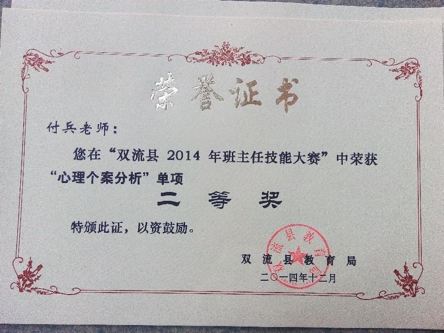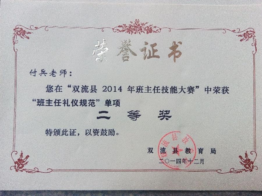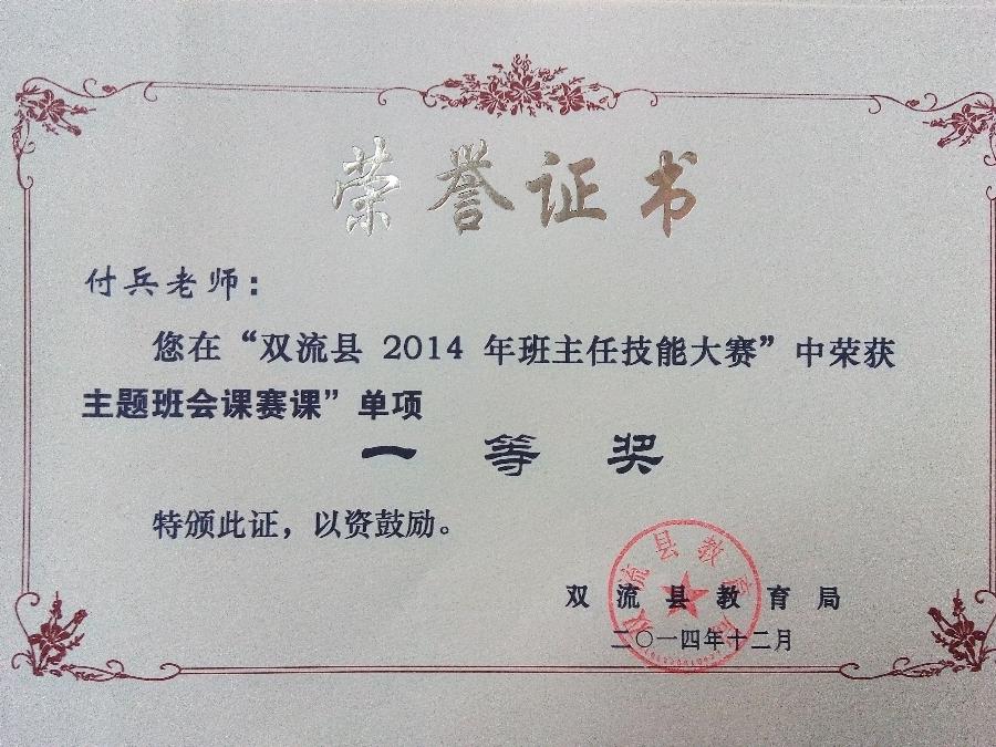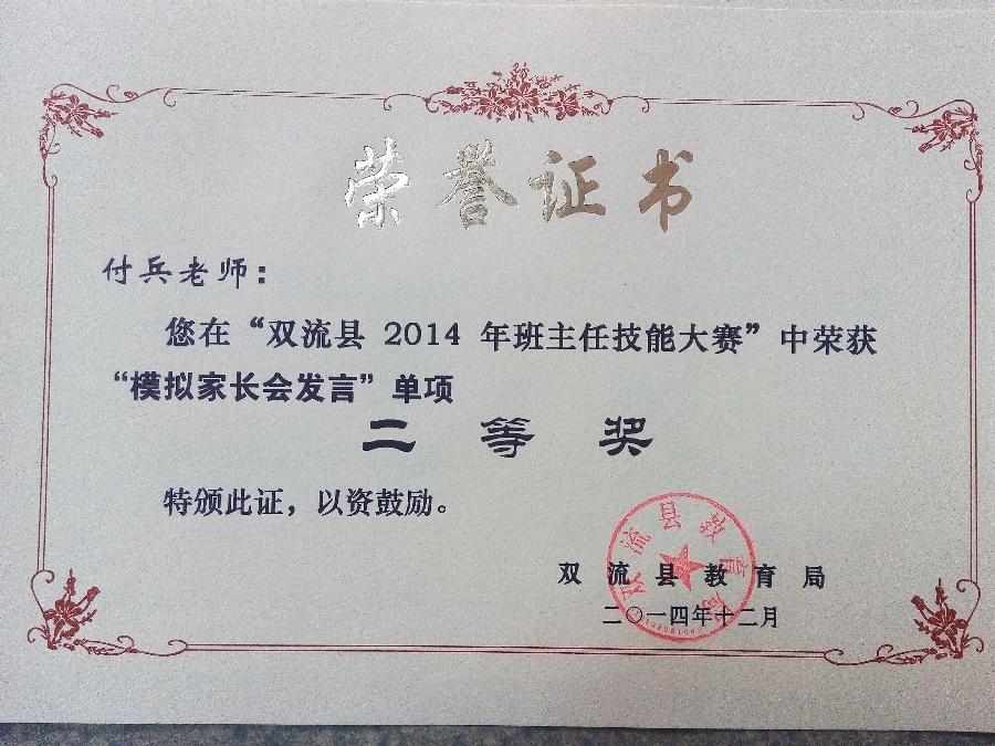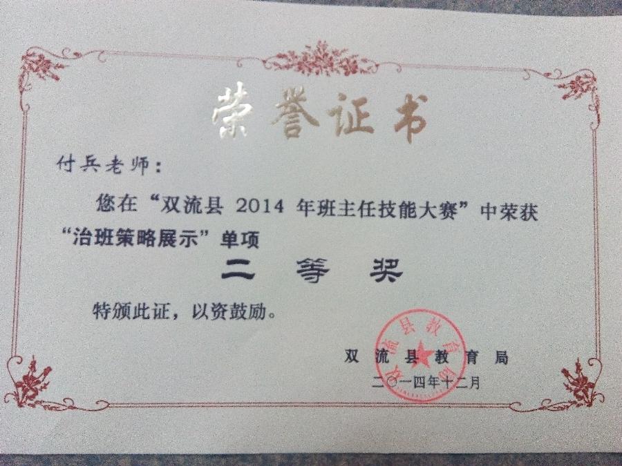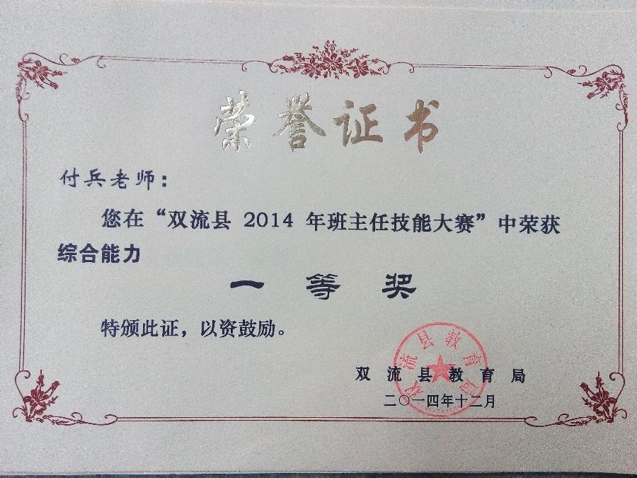 近日,“双流县2014年班主任技能大赛”最终成绩由教育局揭晓。我校青年教师付兵代表学校参赛,取得综合能力一等奖和五项单项奖。