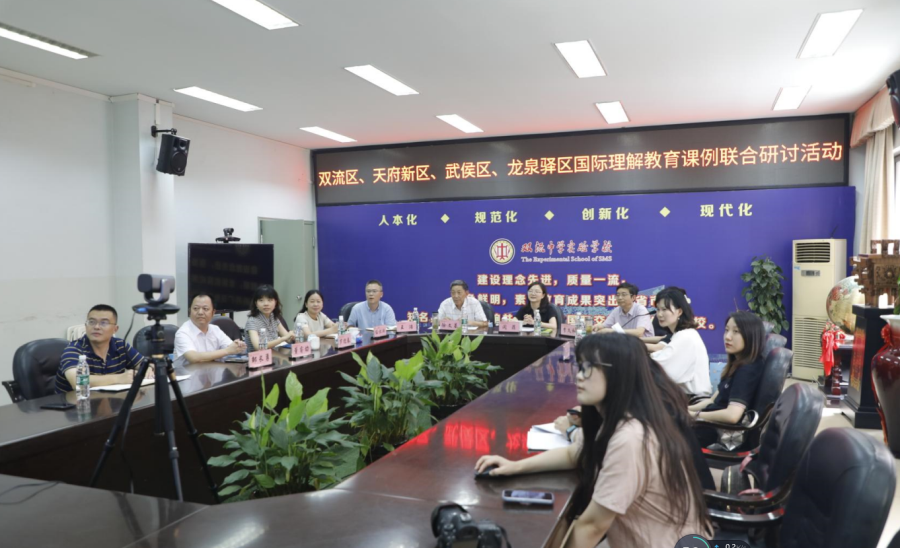 成都市教育对外交流中心副主任闵菲、成都市教育人才服务中心、成都市教育对外交流中心特聘专家徐文基、成都市双流区教育局党建与宣传外联科科长王浩、成都市双流区教科院书记李久和、成都市武侯区教育局对外交流合作科科长任怀远、罗迎春、成都市龙泉驿区教育局对外交流合作中心董睿劫、成都市双流区教育局党建与宣传外联科外事负责人周凡力、成都市双流区教科院职业教育与教育国际化研究室教研员陈嘉立等莅临我校参加线下教研与指导。闵菲主任在研讨会上对国际理解教育课程的开展提出了建议与要求,并希望以本次四区域联动教研为契机,建立常态化的国际理解教育共研机制,以教促研,以研促教,打造优秀课例,向全市示范和推广。