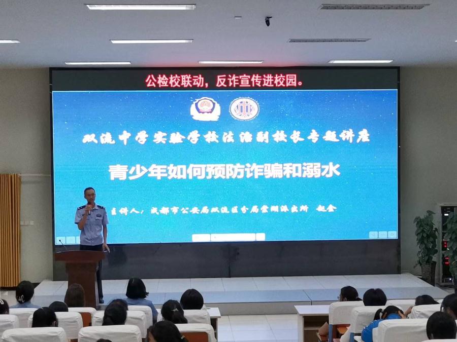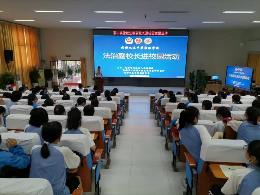 2022年6月23日晚的双中实验校学术演讲厅内,公安民警、检察官、老师、同学共聚一堂,共同举行双流中学实验学校法治副校长进校园活动。