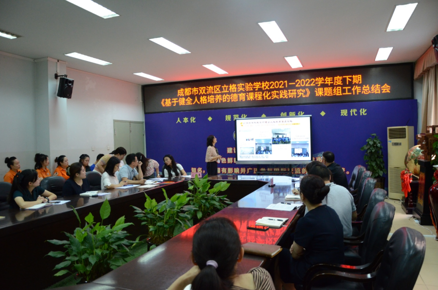 2022年7月6日上午四川省重大科研课题“基于健全人格培养的德育课程化实践研究”学期总结会在双流区立格实验学校第三会议室召开。会上学科方向文科一级子课题组以《让健全人格教育在学科教学活动中顺理成章》为题进行了汇报。汇报人员有晋云萍、胡敏霞、何玲、张玉萍。四位汇报老师从历史学科教研组如何在教学活动中让健全人格顺理成章进行了发言。