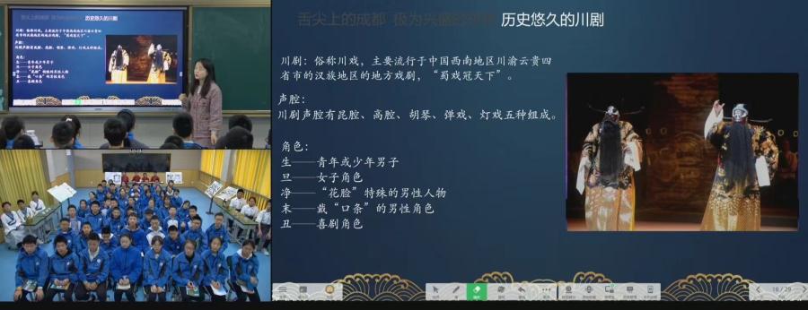 整堂课围绕地方文化奇妙游、舌尖上的成都、极为兴盛的老茶馆、历史悠久的川剧三大板块展开。舌尖上的成都中,川菜组同学通过对比豆腐的不同烹饪手法,带领大家体验成都传统调料和川菜制作,了解川菜特点,并从区域的角度解释原因。极为兴盛的老茶馆板块,学生现场表演长嘴茶壶,迎来了阵阵喝彩,通过茶文化小组同学展示长嘴功夫茶,邀请同学体验,感受非遗的魅力。历史悠久的川剧板块,川剧小组为大家介绍川剧脸谱人物形象后,带领大家沉浸式体验川剧的韵味,学生经历提出问题分析问题的过程,增强学生的地理实践力,体现新课标理念。