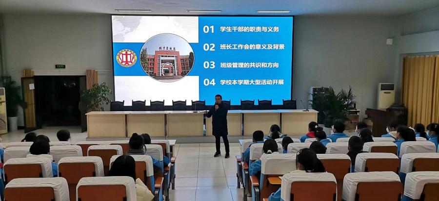 团校委书记王俊老师从学生干部的职责与义务、班长工作会的意义及背景、班级管理的共识和方向等方面对全校学生干部进行了培训。他指出:学生干部作为个体,首先是学生中的优秀者,其次是实现学校与学生之间联系的纽带,再次是学生实现自我教育、自我管理、自我服务的中坚,同时也是实现学校目标和学生管理工作顺利运行的实施者。每一名学生干部都要具有强烈的责任意识 、独特的交往能力 、积极的人生态度和科学的工作精神;要有服务意识、学习意识、团队意识、创新意识和作风意识,积极参与到学校和班级管理和建设中,做学校发展的思考者、文明言行的示范者、班级班风的建设者和引领者。