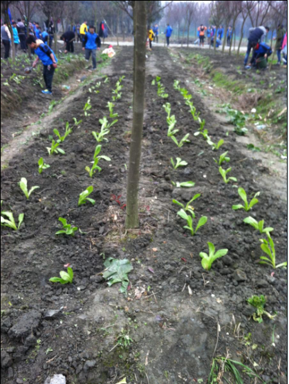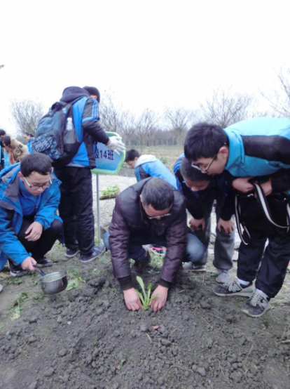 万事俱备,只欠东风。15号至17号三天下午的四个小时时段,学校八年级共22个班学生分三批前往彭镇基地开展蔬菜种植与研究活动。根据前期学生小组长踩点后所作规划,每个班分六个种植研究小组开展活动。学生们按捺不住激动的心情,在指导教师和小组长的统一安排下,迅速而井然的开展活动。有的小组急忙找地儿把早已设计制作好的组牌挂上,标识出“这是我们的一亩三分地”,有的班级在指导老师的召集下,进行着统一化的操作流程。活动中,领取劳动工具的、领取种子秧苗的、锄草的、翻地平土的、量度行距的、打窝的、直播移栽的、打水的、培土浇水的,分工明细,各施其职,协调合作,秩序井然。坚硬的泥土考验着同学们的意志,也挑战着同学们的极限。有的学生使出了九牛二虎之力也只能翻动地的一点表皮,只能望土兴叹,但有一部分学生却是行家里手,锄头在他们手里上下翻飞,再坚硬的泥土也配合着他们的节奏,开始服软。在这部分行家里手的带动下,越来越多的同学学会了翻地,他们彼此配合,一批接着一批征服土地,用一个小时左右的时间,一片松软的土地呈现在了同学们面前,清香的泥土气息弥漫着整个蔬菜园。孩子们根据前期的技术培训知识,并结合现场交流讨论研究,都力求完美的完成种植的各个流程。这里一群,他们在就种苗埋土埋多厚展开了讨论;那里一堆,他们正为播种后是否要盖土而纠结。 “老师,莲花白的种植窝距要多少合适啊?” “老师,浇水要浇多少才算合适呢?”田间里,只见四个农技员、各班指导老师像消防员一样,在各小组的苗圃间来回穿梭,他们马不停蹄,忙得不亦乐乎。附近路过的农民老大爷也不仅驻足,看着这热火朝天的场面,禁不住挽起裤管走到田间。老人不遗余力的,热情的,耐心的指导着这些不识五谷杂粮的孩子们。他们手把手的教,似乎要把毕生所积累的劳作“秘笈”统统的传给这些孩子们。孩子们也个个认真、专注的学习着,实践着。下午4点左右,在农技员、指导老师和老大爷的指导帮助下,各班陆陆续续完成了自己的种植任务。望着这一块块种植地,有种莲花白的,有种莴笋的,有种菠菜、生菜的。有些行列虽不够整齐,但这埋没不了孩子们第一次真实种植体验的艰辛;有些秧苗偏偏倒倒,但这依然掩盖不了孩子们在合作探究中绽放的青春活力。