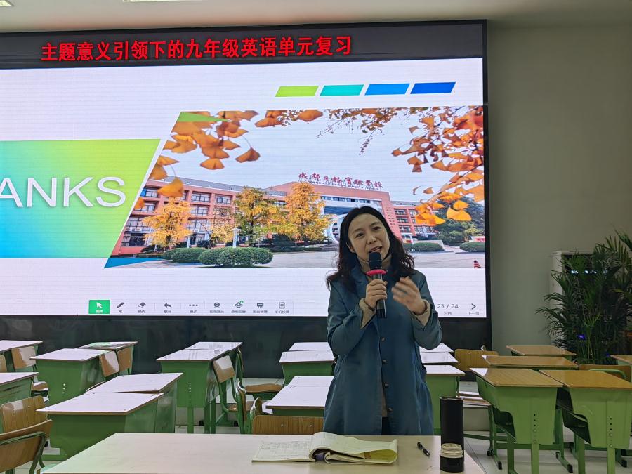 接着,成都市教科院的初中英语教研员薛蕾蕾老师对本节课进行了点评。她肯定了这节课的六大优点:1.陈琦老师很好地将教材各个板块之间的知识串联起来,并帮助学生形成了结构化的知识。2. 语言知识的呈现比较丰富,并及时整理小结,支撑了每个环节的表达。3. 选择了与中考链接的活动,提升了学生的综合能力。 4. 将课本教材改成选词填空,既强化复习了课本所学的重点词汇,也复习了学习策略“前缀和后缀的运用” 。5. 拓展阅读的语篇文章比较新颖,对课本内容进行了很好的延伸。6. 作业设置合理:有课前,课中和课后的任务 ,写作的输出能联系学生实际。她认为本节课是立格实验学校对于复习课的一种创新设计,很有亮点。同时薛老师也对本节课提出了中肯的建议:如可以在课前给学生单元主题框架图,让学生在主题图的引领下来完成单元知识体系的构建。她还提出九年级老师务必要思考怎么给九年级学生减负增效,一定要在教学设计,作业设计,命题上多下工夫。薛老师在评课后还就“教学评一体化”作了相关发言。