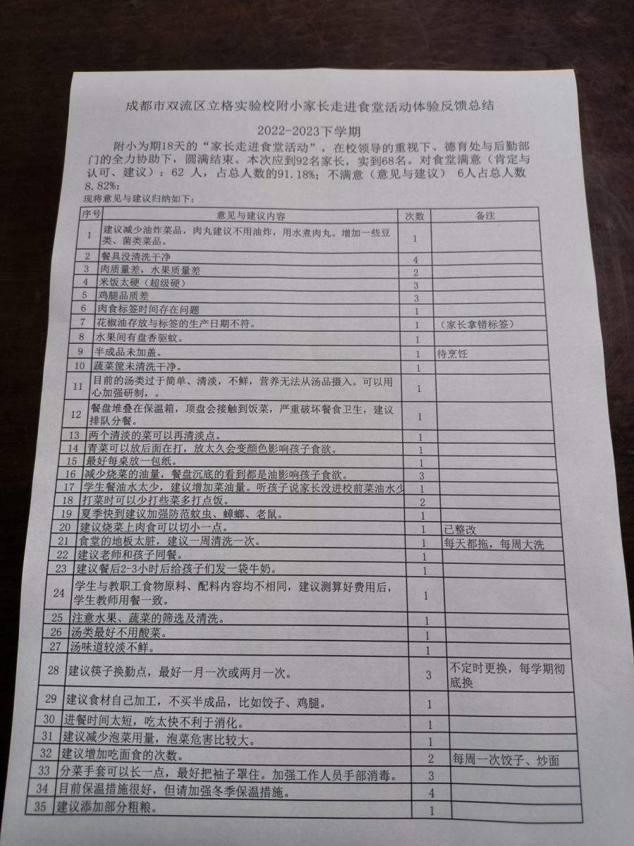 在学校后勤和小学部德育处的共同组织下,60多位小学家委会代表分批参加了“走进食堂”活动。家长们在食堂工作人员的带领下,换上干净的工作服,戴上头套、手套,认真参观了食堂主食库、副食库、蔬菜加工间、肉类加工间、操作间,针对家长们在参观时提出的各种问题,食堂管理人员都做了耐心细致的解释。参观完成后,家长们品尝了小学学生餐,并根据参观的情况,对食堂做得好的方面给予了充分肯定,也给食堂工作提出了中肯的建议。学校将根据实际情况,对具有代表性的建议汇总疏理后,及时做出适当调整。