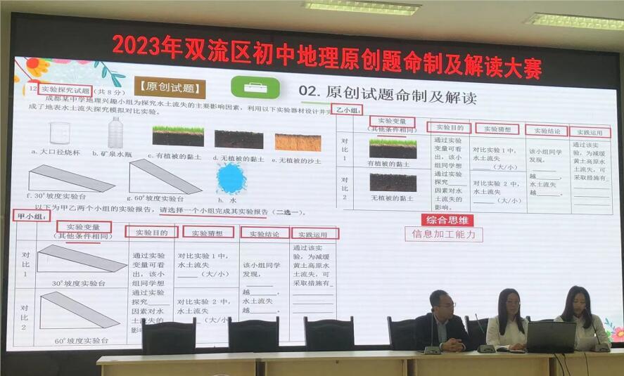 4月6日,2023年双流区地理学科毕业班教师原创题命制及解读大赛活动于在成都立格实验学校如期举行。成都市地理教研员杨远双老师、青羊区地理教研员庄永红老师担任本次大赛评委,全区所有地理老师观摩本次比赛。