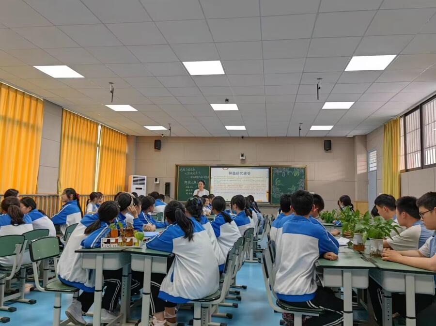 2023年4月20日下午第九课,在录课室,历史组张玉萍老师和2025届四班的全体同学共同进行了彭镇蔬菜基地种植阶段成果汇报。