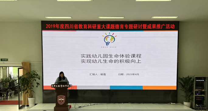 成都市新都区机关幼儿园杨雪副园长就《实践体验式生命教育课程,实现幼儿生命的积极向上》进行了成果分享,通过介绍生态园所的构建和春播节活动,形象生动的展示课题研究的成果及成果的运用。