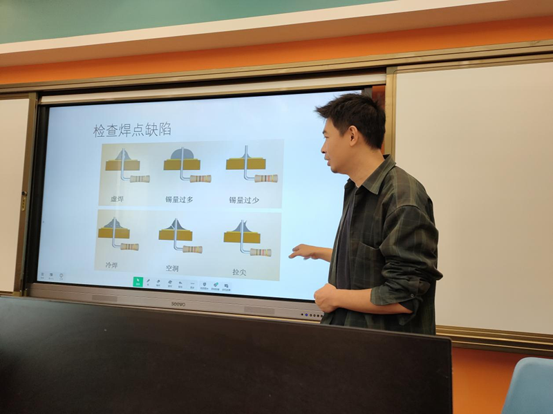 主要认识自动化焊接和人工焊接工具,电烙铁的结构、操作规范,使用方法及养护流程等。王老师讲解了多种元件的焊接技巧,尤其是多脚元件焊接的注意事项。此外,王老师还耐心地教大家怎么检查焊点缺陷的方法。