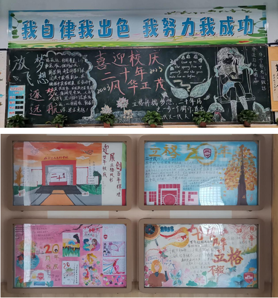 在学校建校20周年之际,我校各班开展了本学期第二次班级文化建设活动。此次班级文化建设以建校二十周年校庆为主题。同学们发挥自己的艺术才华,通过绘画创作班级校庆主题展板,表达内心对学校的热爱和祝福之情。