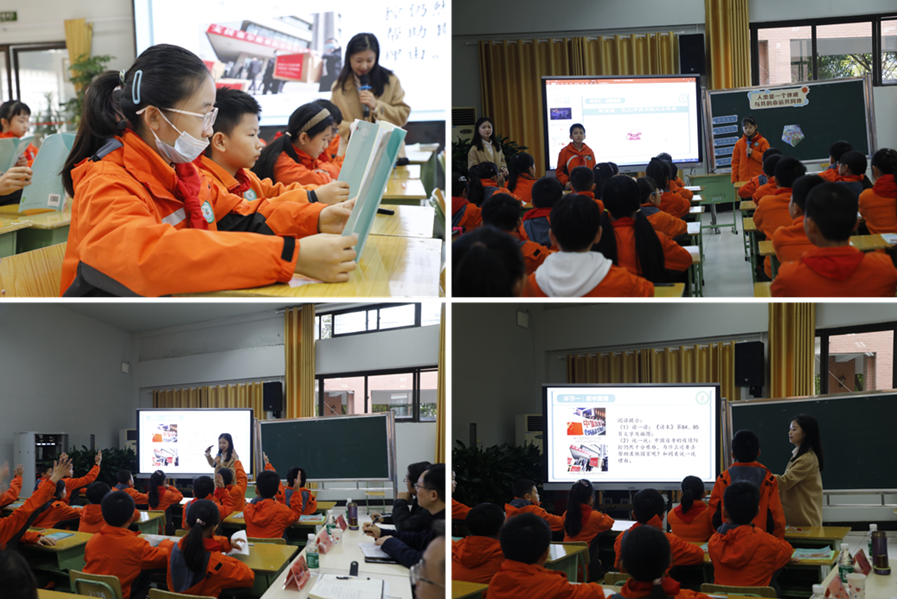 第一节是成都立格实验学校附小彭诗菊老师带来的小学课堂展示。彭老师根据小学生的认知水平和接受能力,以“一带一路故事会”为主题,创设“新闻播报、巴以冲突中的父女谈话、一带一路温暖故事、成都大运会志愿者回忆录、海洋动物核处容身”一系列结构化情境,调动学生全员参与,深入探索构建人类命运共同体的必要性和具体目标,树立“人类命运共同体”意识。整堂课的各环节之间环环相扣,不断向纵深展开,引导学生在理解人类命运共同体理念的过程中,拓展眼界,提升思维能力。