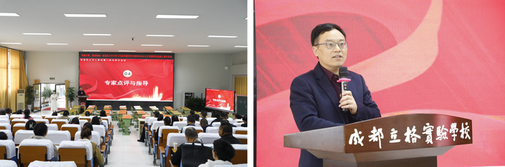 课堂展示后,四川大学马克思主义学院副院长李建华做专家点评,他首先指出大中小学思政课一体化建设是当前思想政治教育的一项重点工作,双流区此次活动,不仅给全市乃至全省都做出了示范。点评中,李院长提出思政课建设的“九个度”,即分段准备的充度、跨段内容的完整度、各段难点的突破度、理论和实践的结合度、教学科研成果的融合度、各段老师的参与度、学生的满意度、备课要素的协同度、一体化目标的达成度。此外,他还指出大中小学思政课一体化建设应该体现出“链”的思维、“统”的导向、“合”的理念,供参会老师学习与思考。